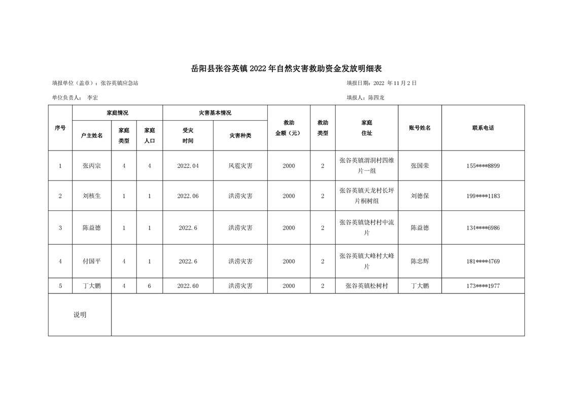 嶽陽縣張穀英鎮2022年自然災害救助資金發放明細表
