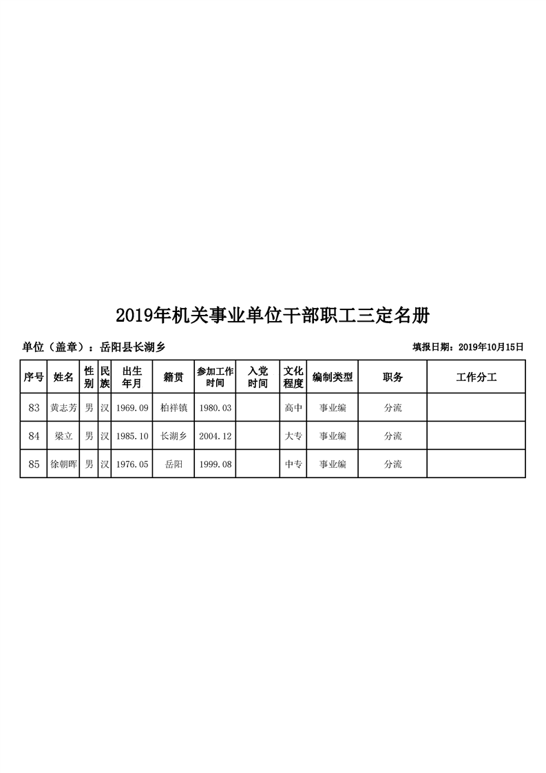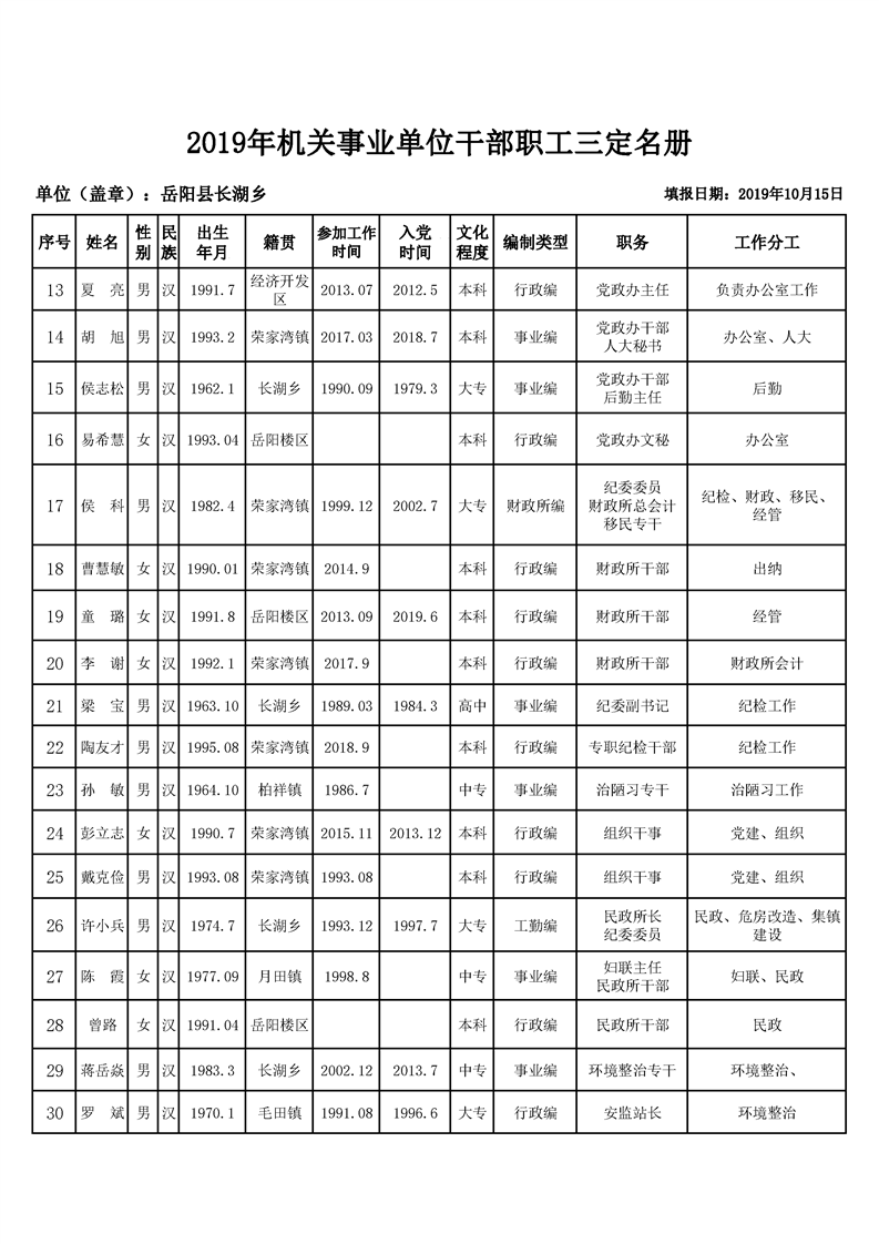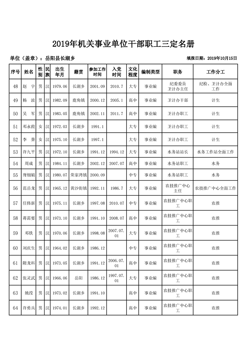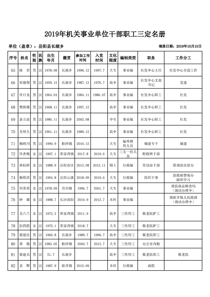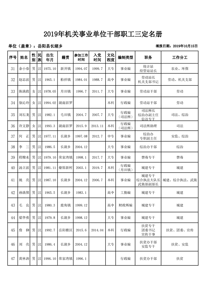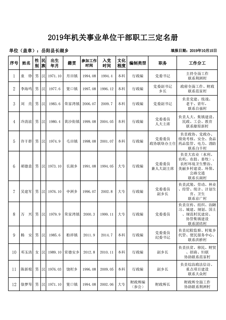長湖鄉2019年機關三定名冊