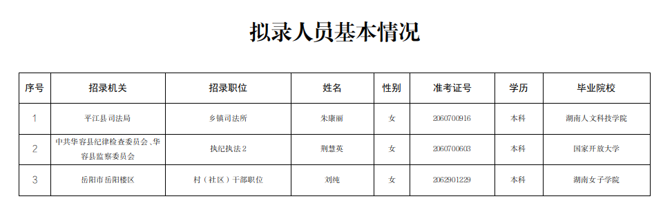根據《湖南省2022年考試錄用公務員公告》及有關規定,經報名、筆試、資格審查、麵試、體檢、考察等程序,確定朱康麗、荊慧英、劉純3名同誌(因懷孕延期體檢,產後體檢合格)為2022年度擬錄用公務員,現予以公示。