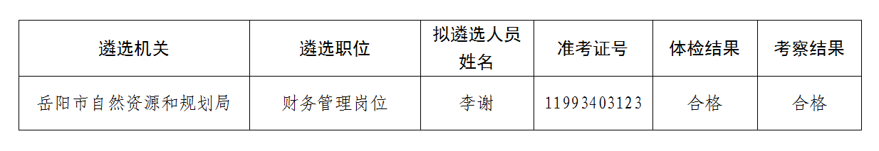 根據《2022年嶽陽市市直機關公開遴選公務員公告》要求,經筆試、麵試、體檢、考察、遴選機關黨組集體研究等程序,現確定遞補李謝同誌為擬遴選人員,現按要求予以公示: