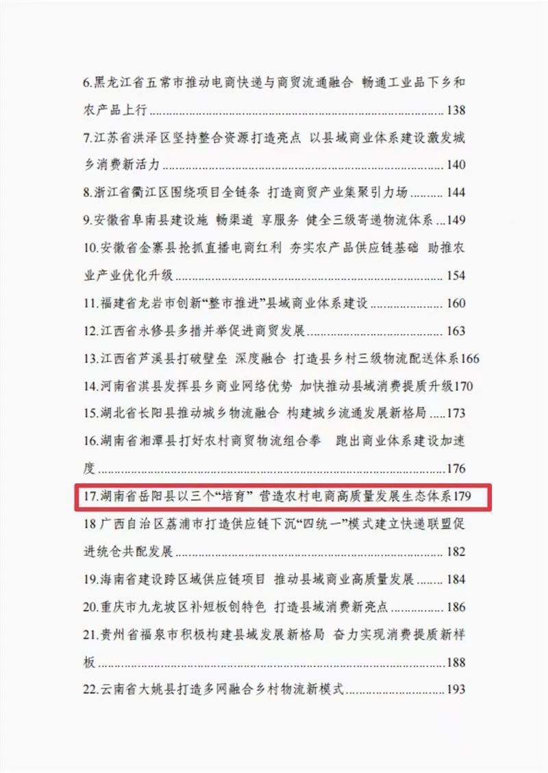 近年來,嶽陽縣依托全國電子商務進農村綜合示範縣項目,大力推進全縣商業體係建設,經過兩年來的運營,縣域商業網點不斷健全,物流配送服務持續優化,農產品上行能力逐步增強,形成了縣域商業體係發展新格局。2023年10月,“湖南省嶽陽縣以三個‘培育’營造農村電商高質量發展生態體係”工作經驗入選全國縣域商業體係建設地方經驗,在國家商務部《縣域商業體係建設工作手冊》中作為地方經驗全國推介。