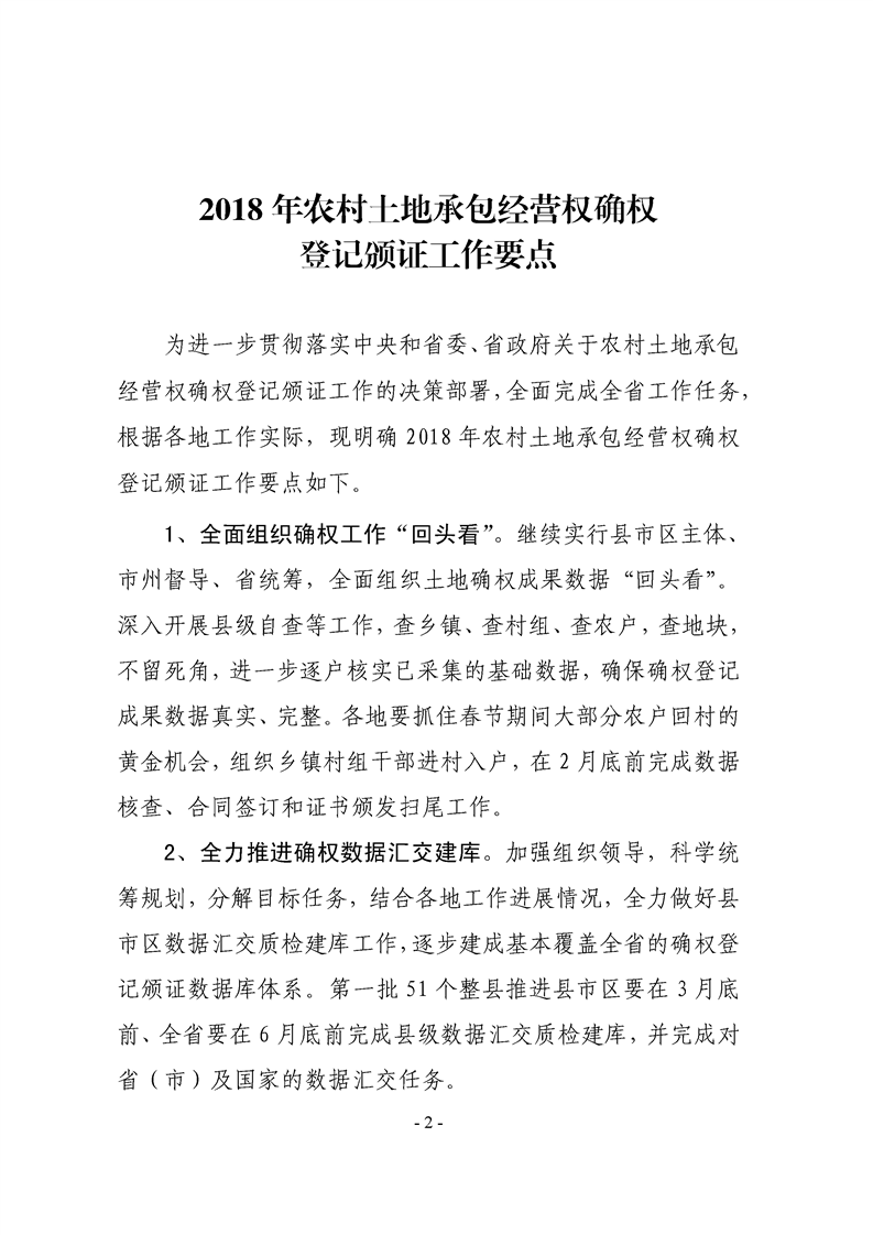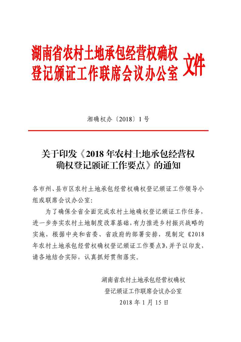 關於印發《2018 年農村土地承包經營權確權登記頒證工作要點》的通知(湘確權辦〔2018〕1 號)