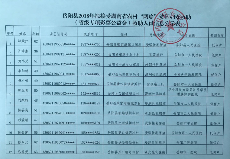 嶽陽縣2018年擬接受湖南省農村“兩癌”貧困婦女救助 (省級專項彩票公益金)救助人員信息公示表