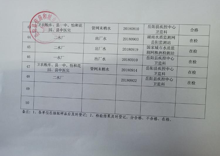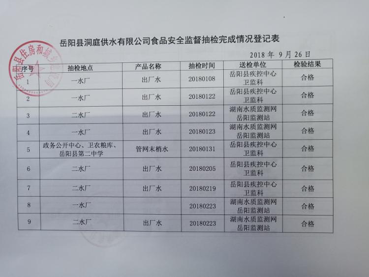 嶽陽縣洞庭供水有限公司食品安全監督抽檢完成情況登記表