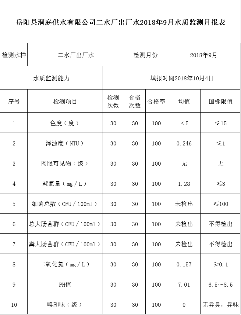 嶽陽縣洞庭供水有限公司二水廠出廠水2018年9月水質監測月報表