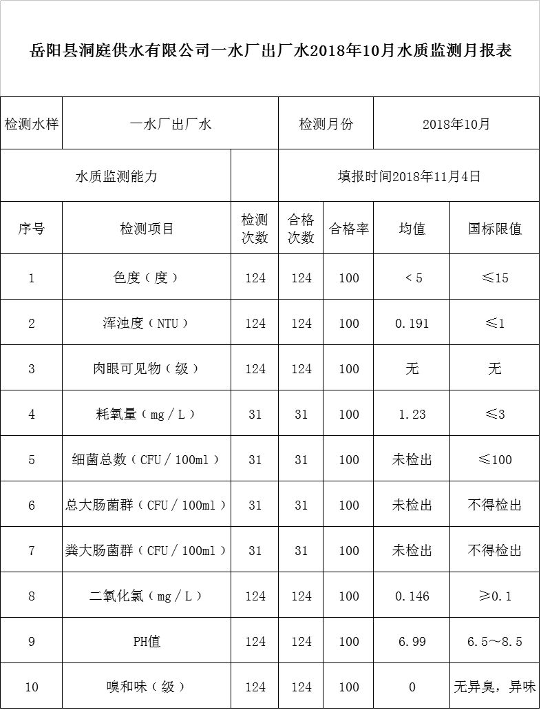 嶽陽縣洞庭供水有限公司一水廠出廠水2018年10月水質監測月報表
