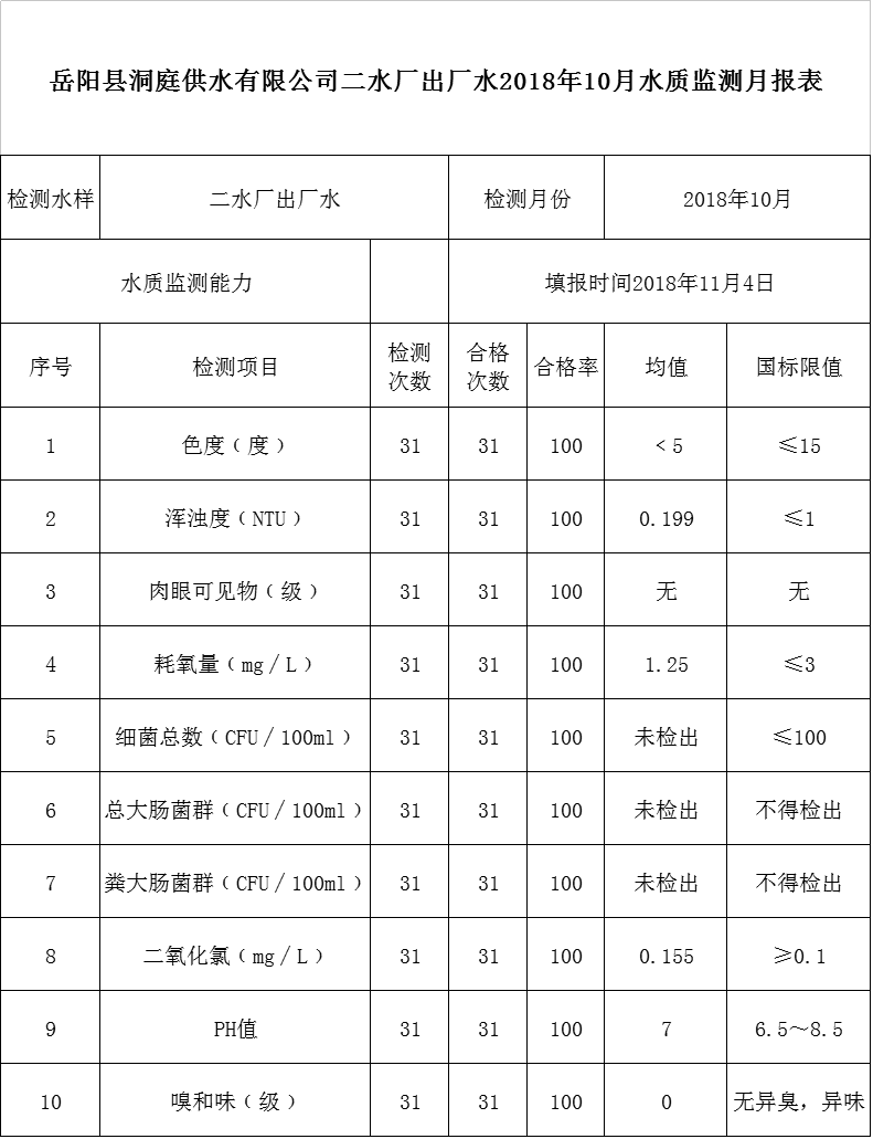 嶽陽縣洞庭供水有限公司二水廠出廠水2018年10月水質監測月報表