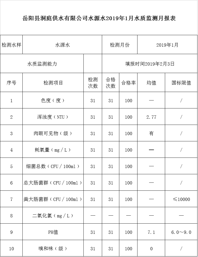嶽陽縣洞庭供水有限公司水源水2019年1月水質監測月報表