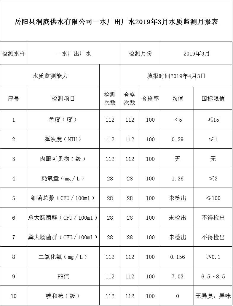 嶽陽縣洞庭供水有限公司一水廠出廠水2019年3月水質監測月報表