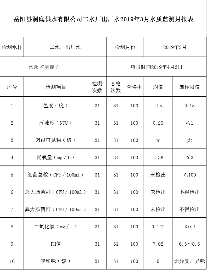 嶽陽縣洞庭供水有限公司二水廠出廠水2019年3月水質監測月報表