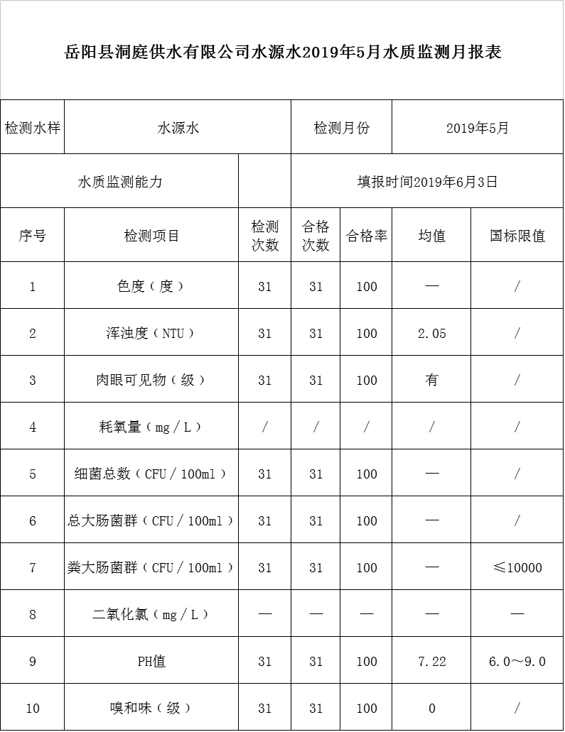 嶽陽縣洞庭供水有限公司水源水2019年5月水質監測月報表
