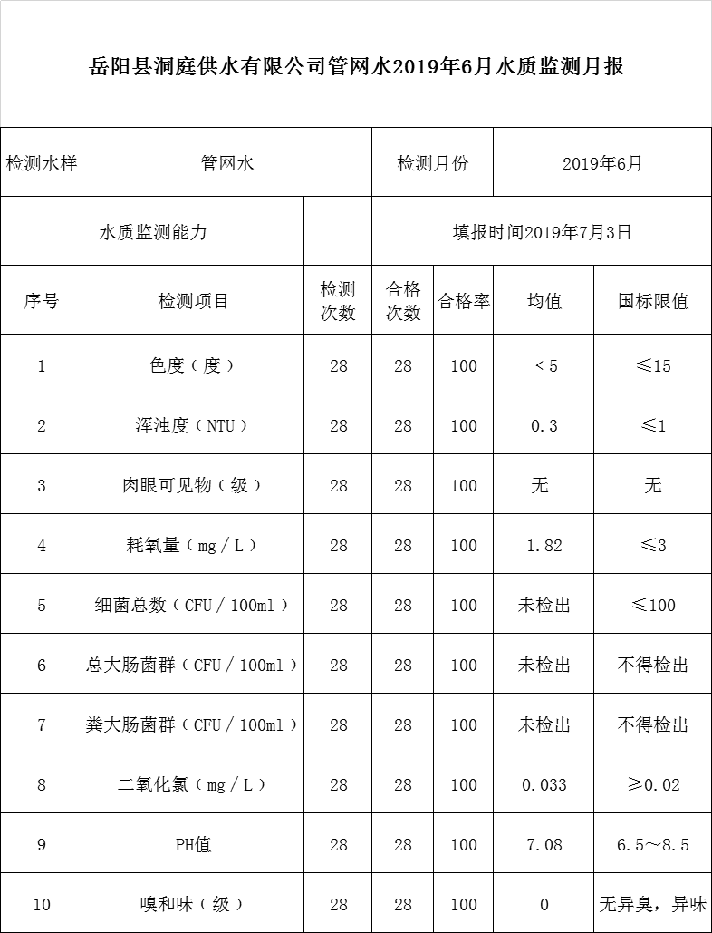 嶽陽縣洞庭供水有限公司管網水2019年6月水質監測月報