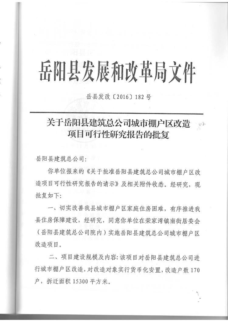關於嶽陽縣建築總公司城市棚戶區改造項目可行性研究報告的批複
