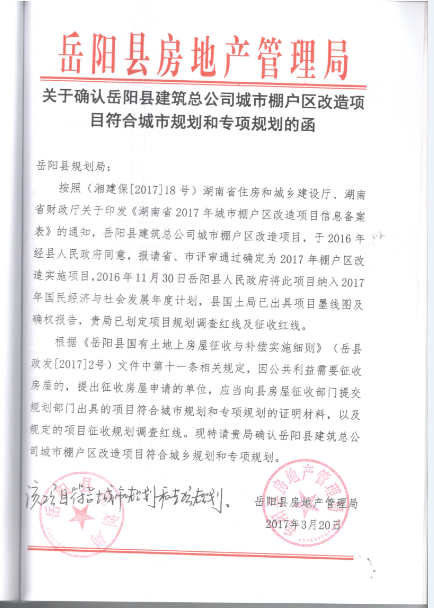 關於確認嶽陽縣建築總公司城市棚戶區改造項目符合城市規劃和專項規劃的函
