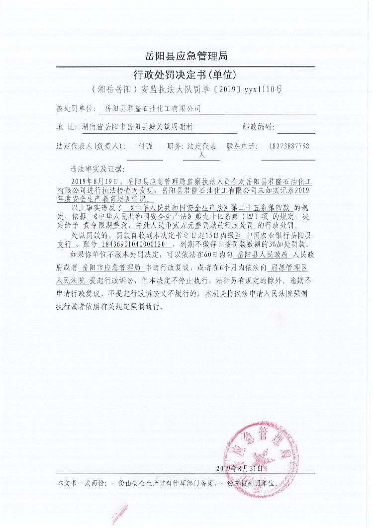 行政處罰決定書(湘嶽嶽陽安監執法大隊罰單〔2019 〕yyx1110號)