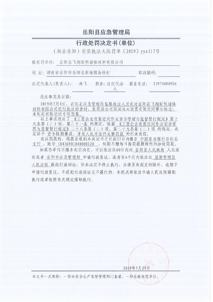 行政處罰決定書(湘嶽嶽陽安監執法大隊罰單〔2019 〕yyx117號)