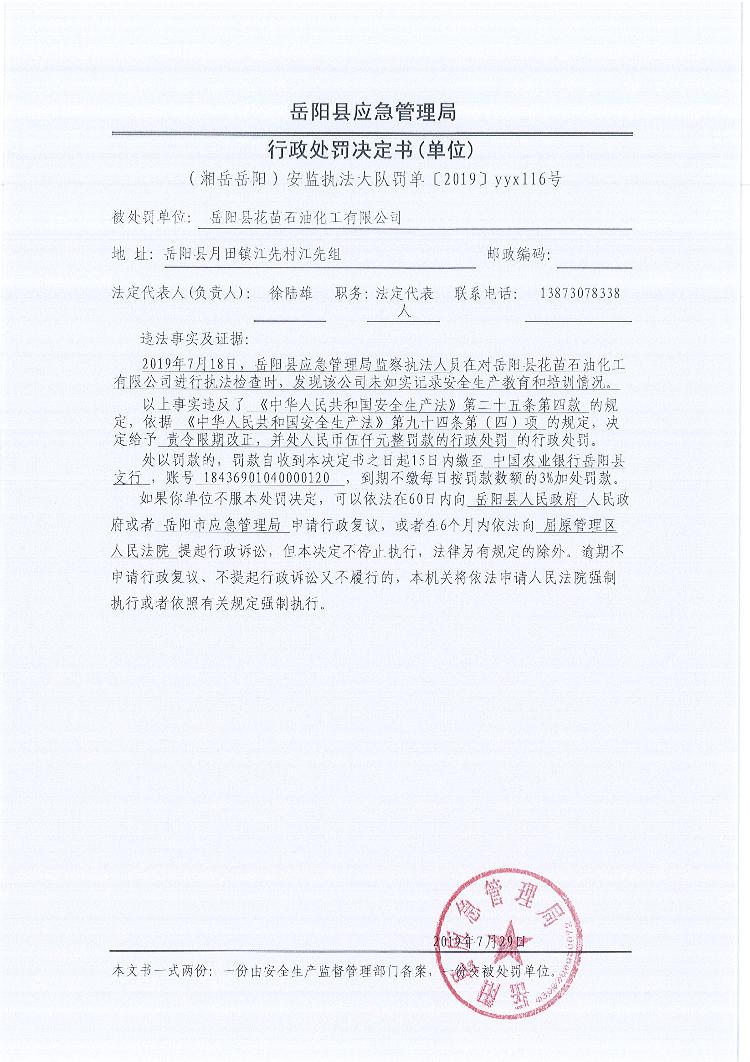 行政處罰決定書(湘嶽嶽陽安監執法大隊罰單〔2019 〕yyx116號)