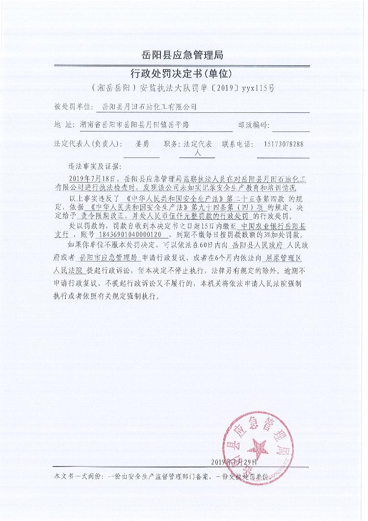 行政處罰決定書(湘嶽嶽陽安監執法大隊罰單〔2019 〕yyx115號)