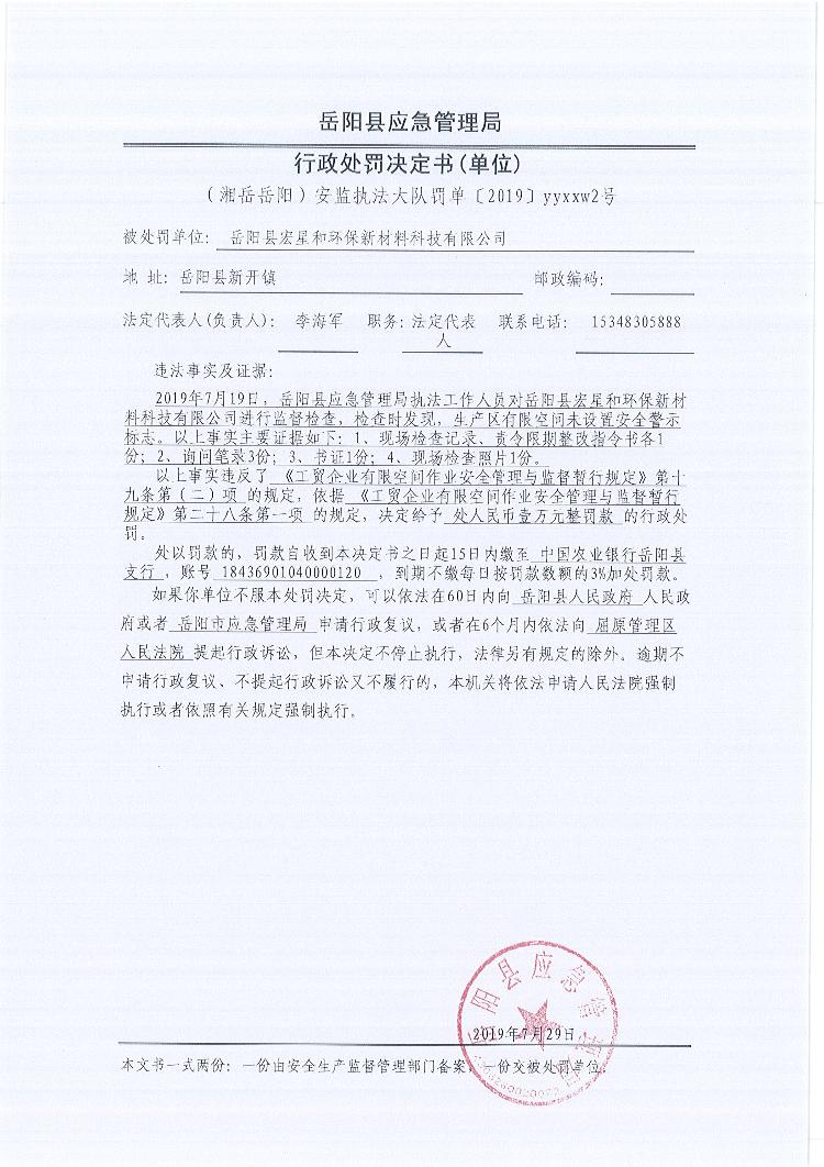 行政處罰決定書(湘嶽嶽陽安監執法大隊罰單〔2019 〕yyxxw2號)
