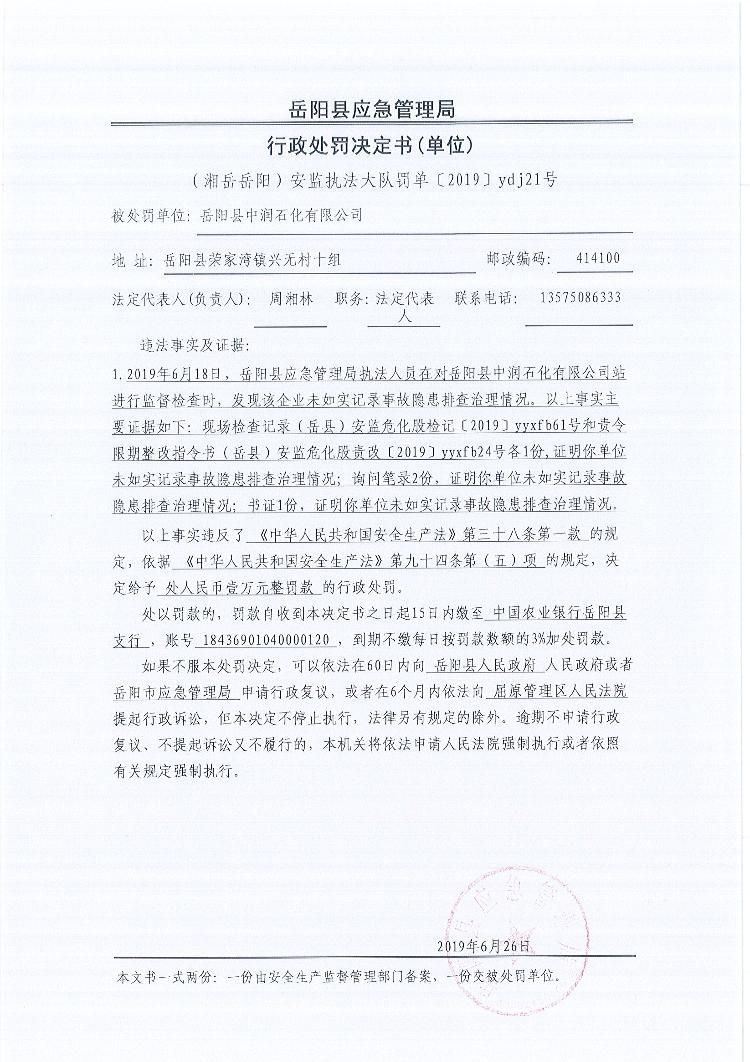 行政處罰決定書(湘嶽嶽陽安監執法大隊罰單〔2019 〕ydj21號)