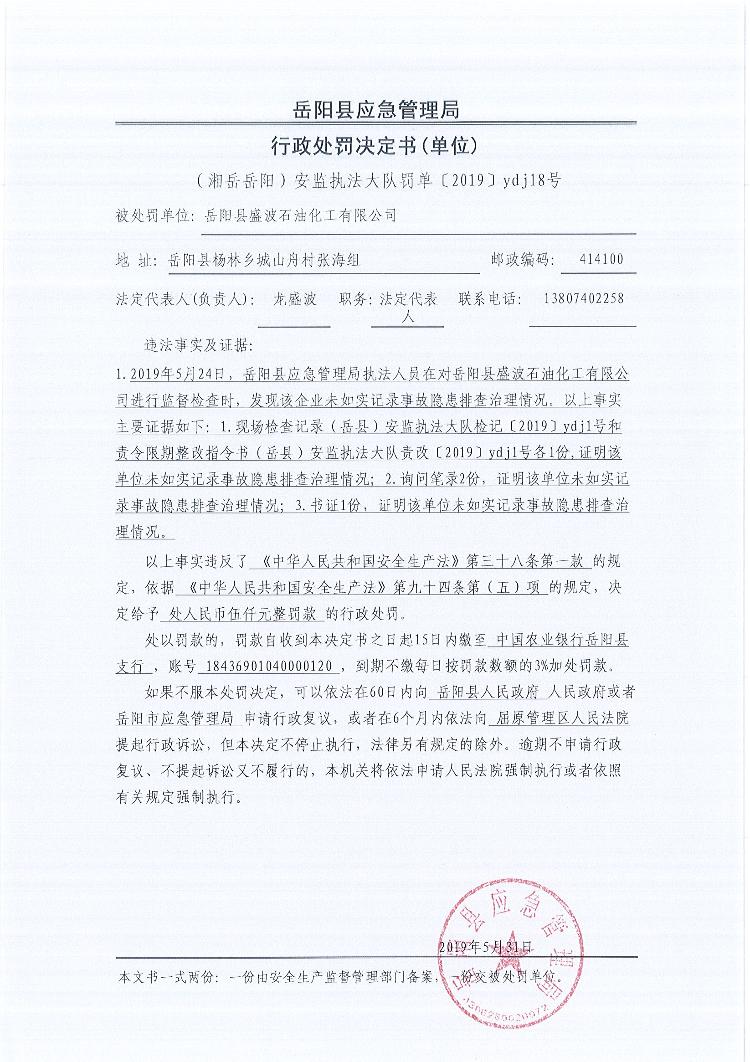 行政處罰決定書(湘嶽嶽陽安監執法大隊罰單〔2019 〕ydj18號)