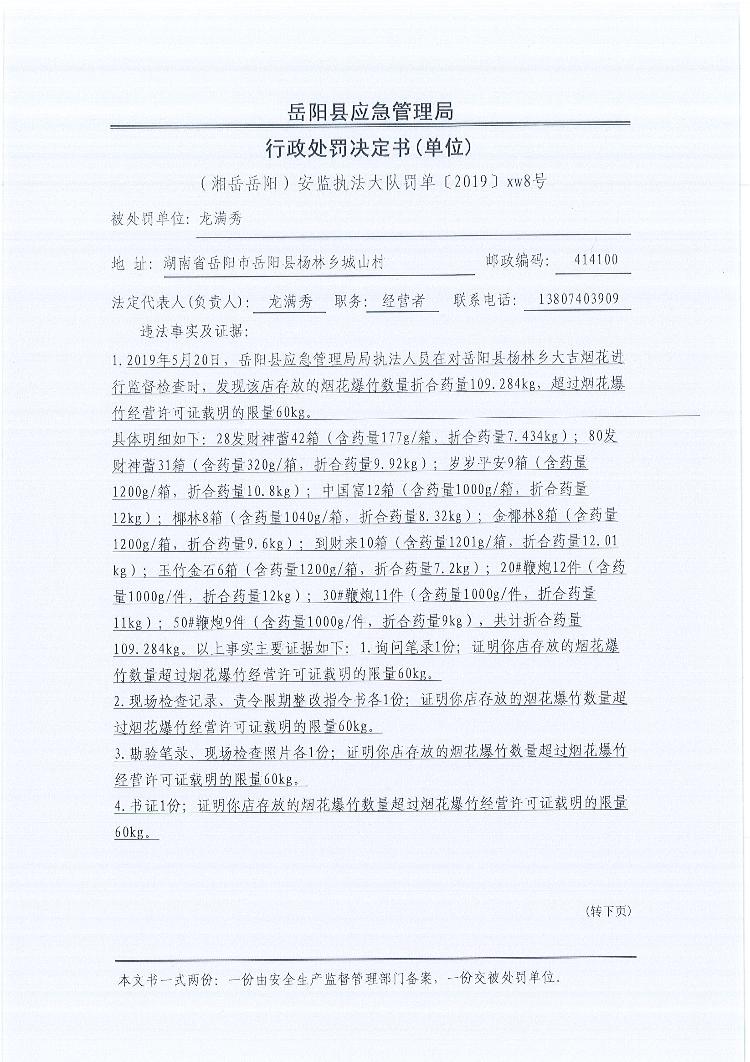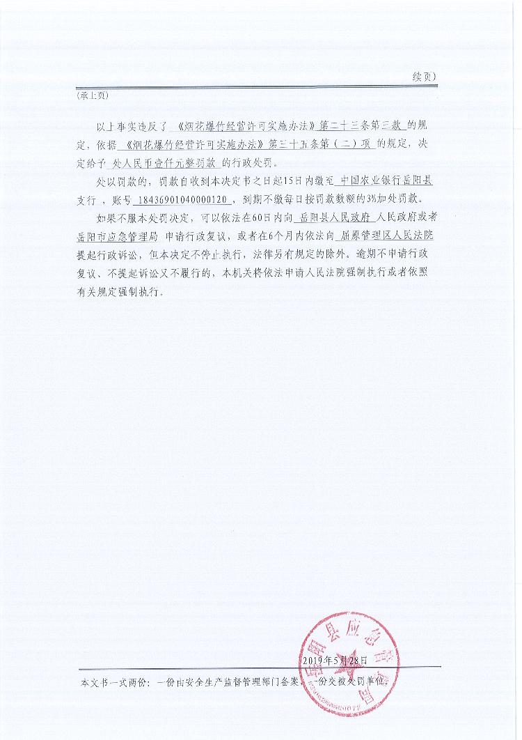 行政處罰決定書(湘嶽嶽陽安監執法大隊罰單〔2019 〕xw8號)