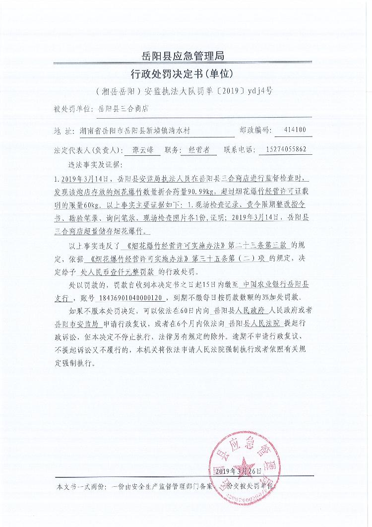 行政處罰決定書(湘嶽嶽陽安監執法大隊罰單〔2019 〕ydj4號)
