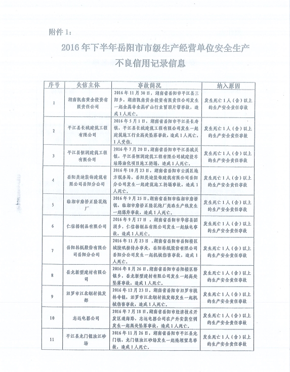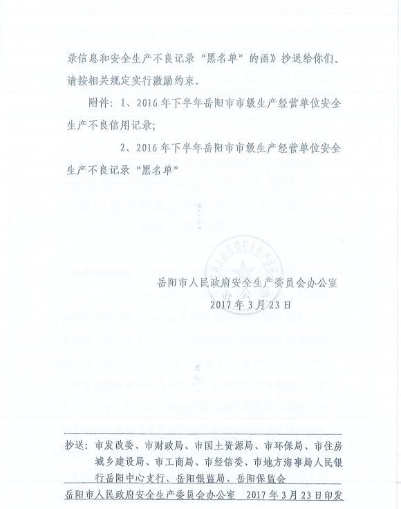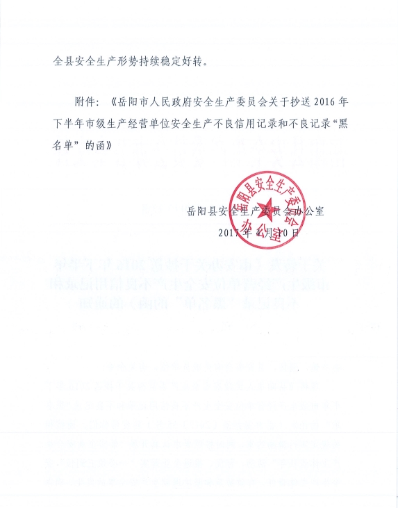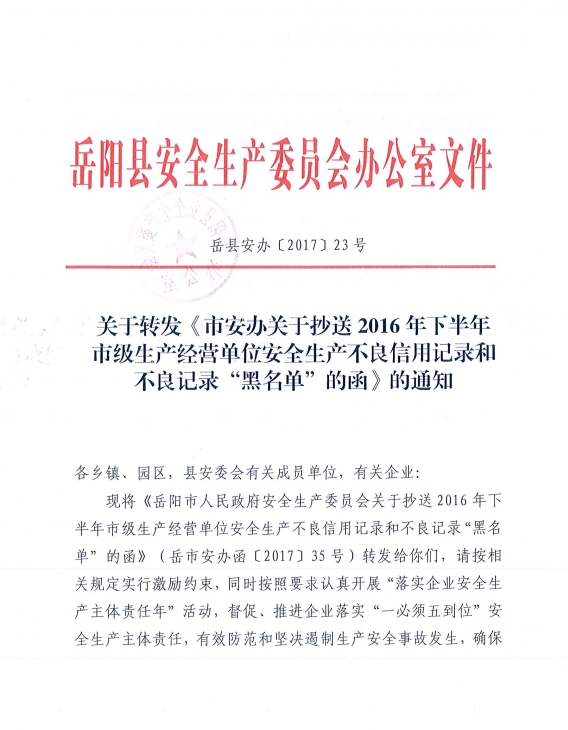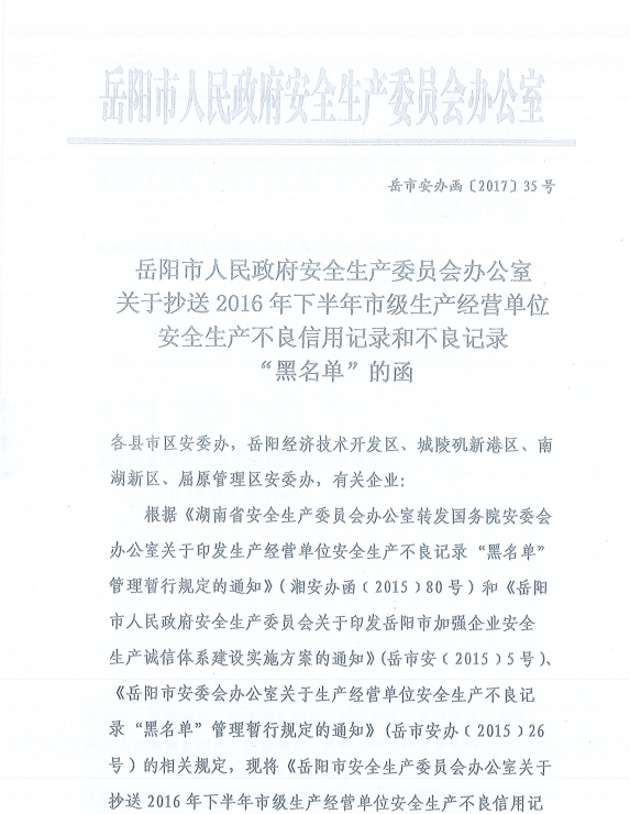嶽陽縣安委辦關於轉發《市安辦關於抄送2016年下半年市級生產經營單位安全生產不良信用記錄和 不良記錄“黑名單”的函》的通知