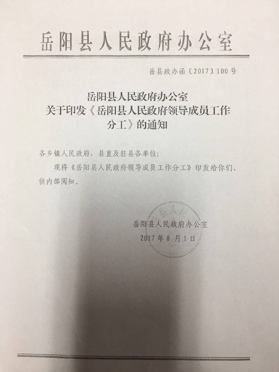關於印發《嶽陽縣人民政府領導成員工作分工》的通知