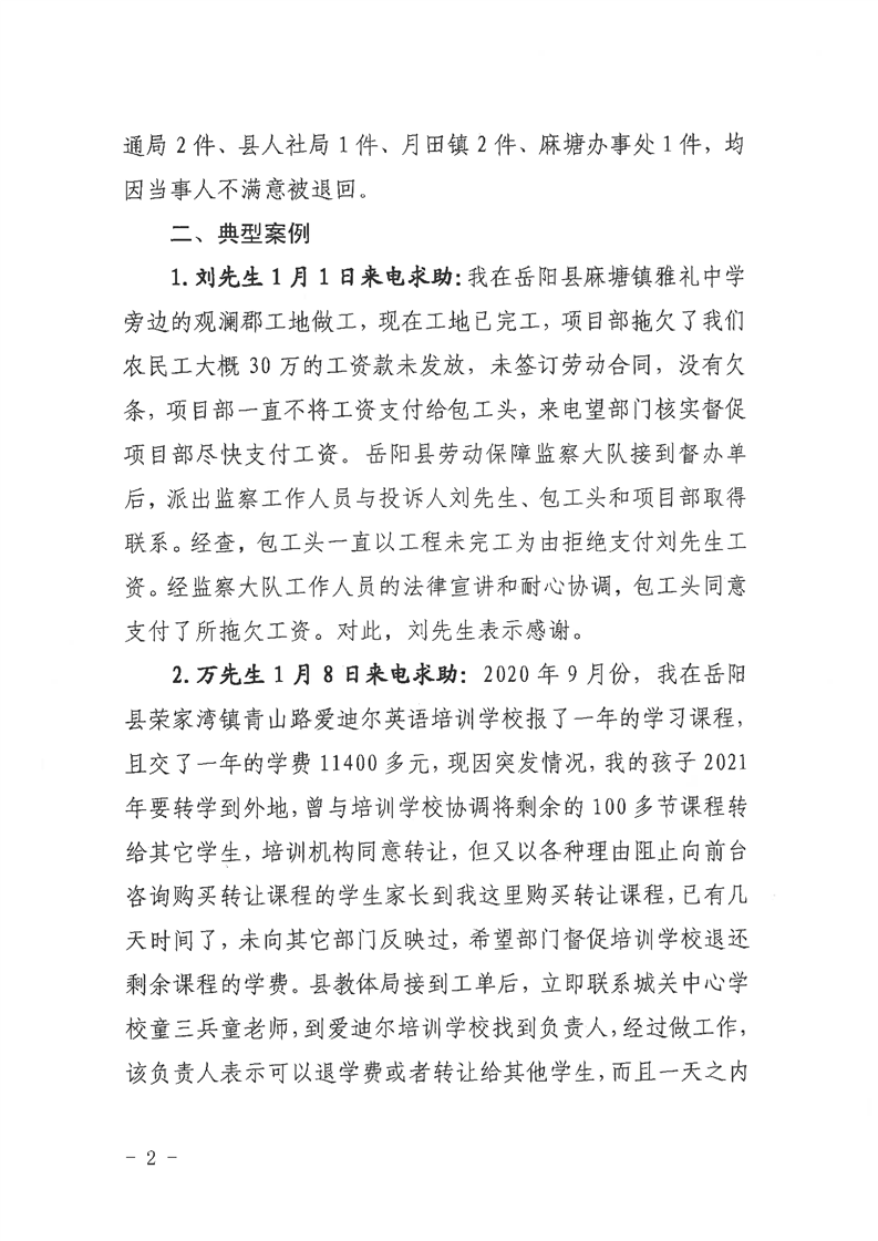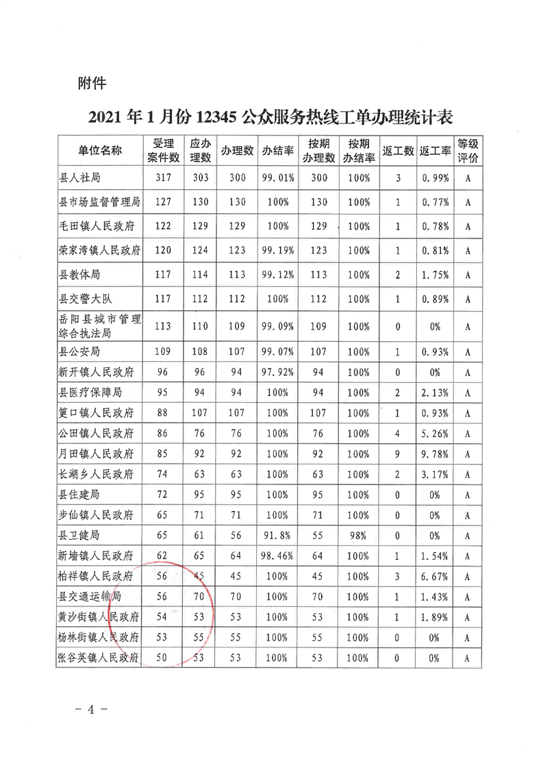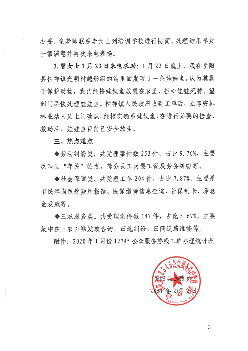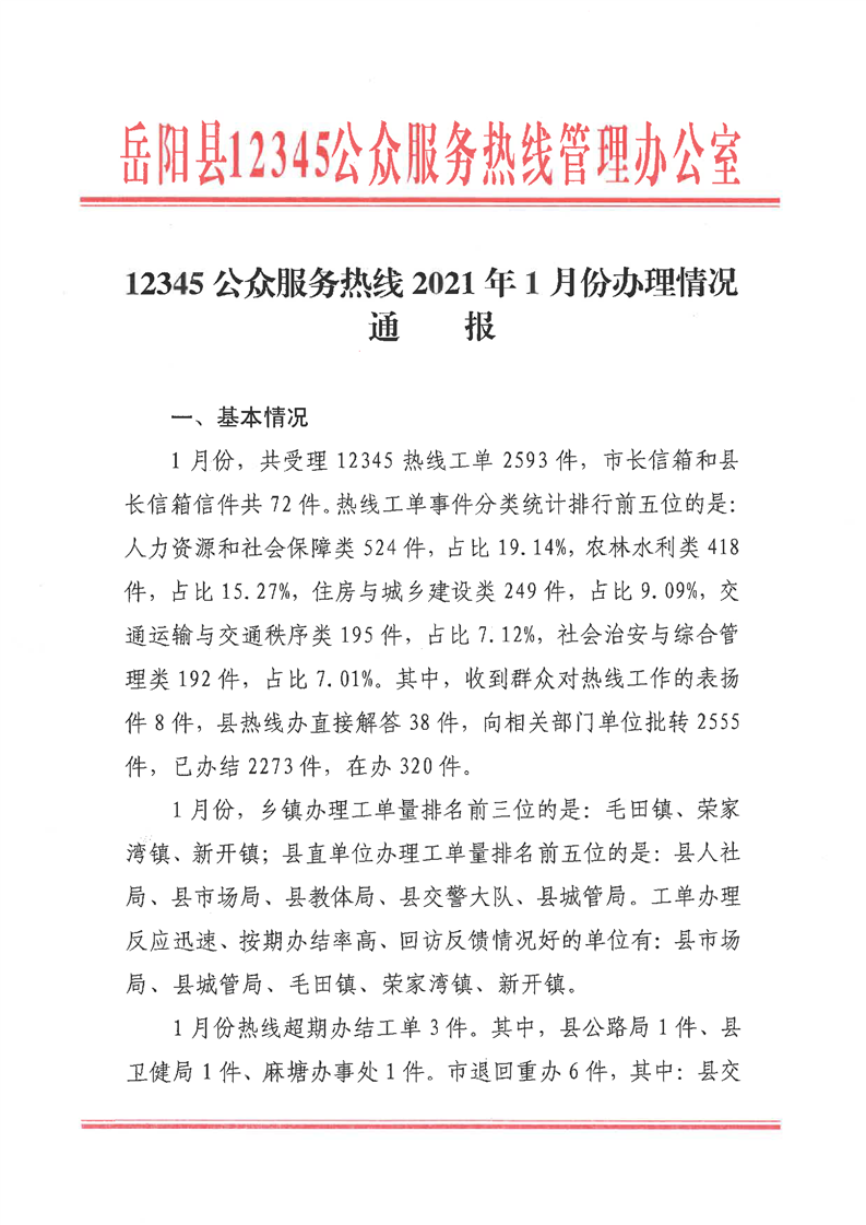 嶽陽縣12345公眾服務熱線2021年1月辦理情況通報