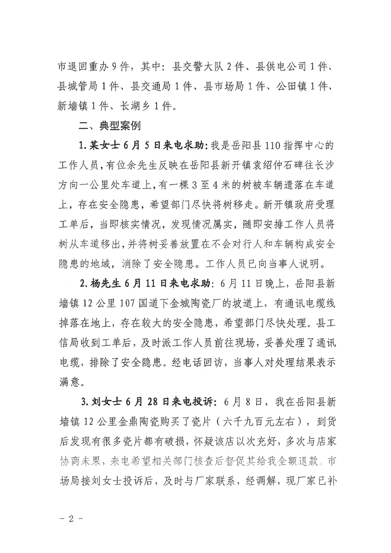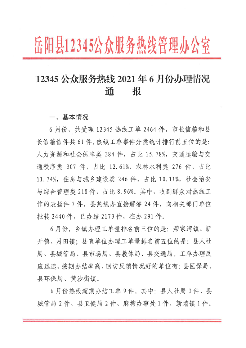 嶽陽縣12345公眾服務熱線2021年6月辦理情況通報