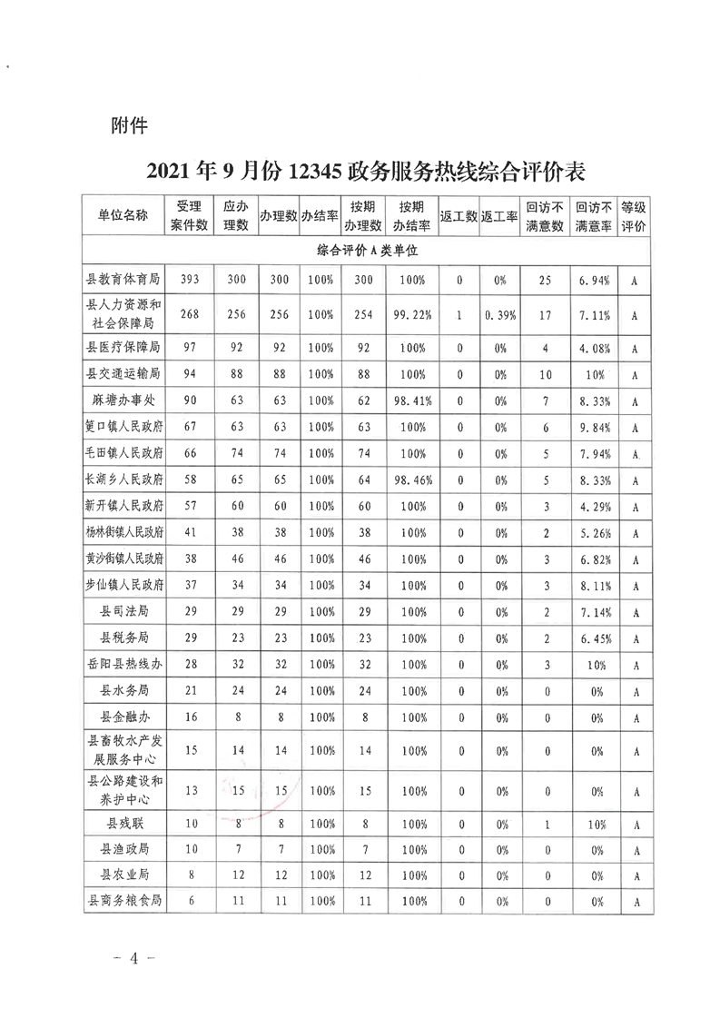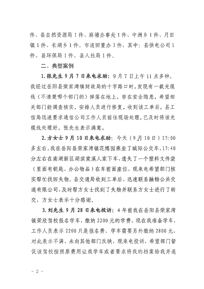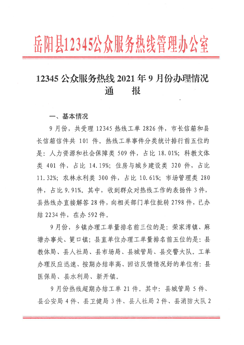 嶽陽縣12345公眾服務熱線2021年9月辦理情況通報