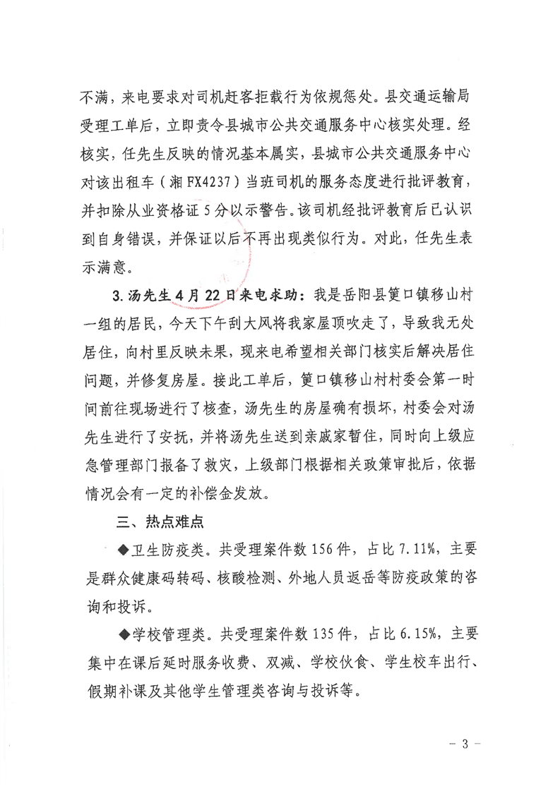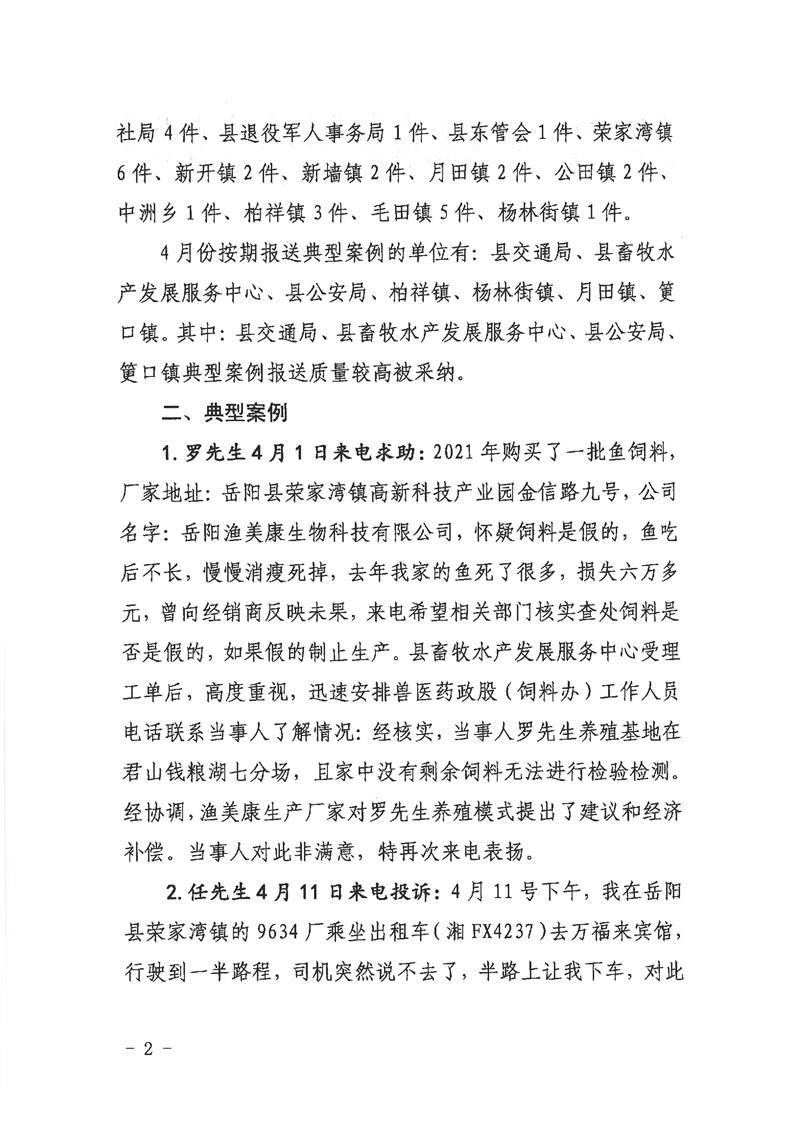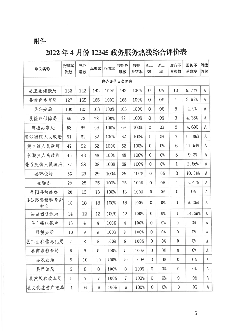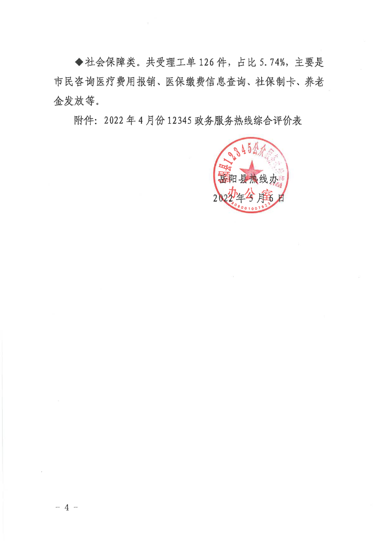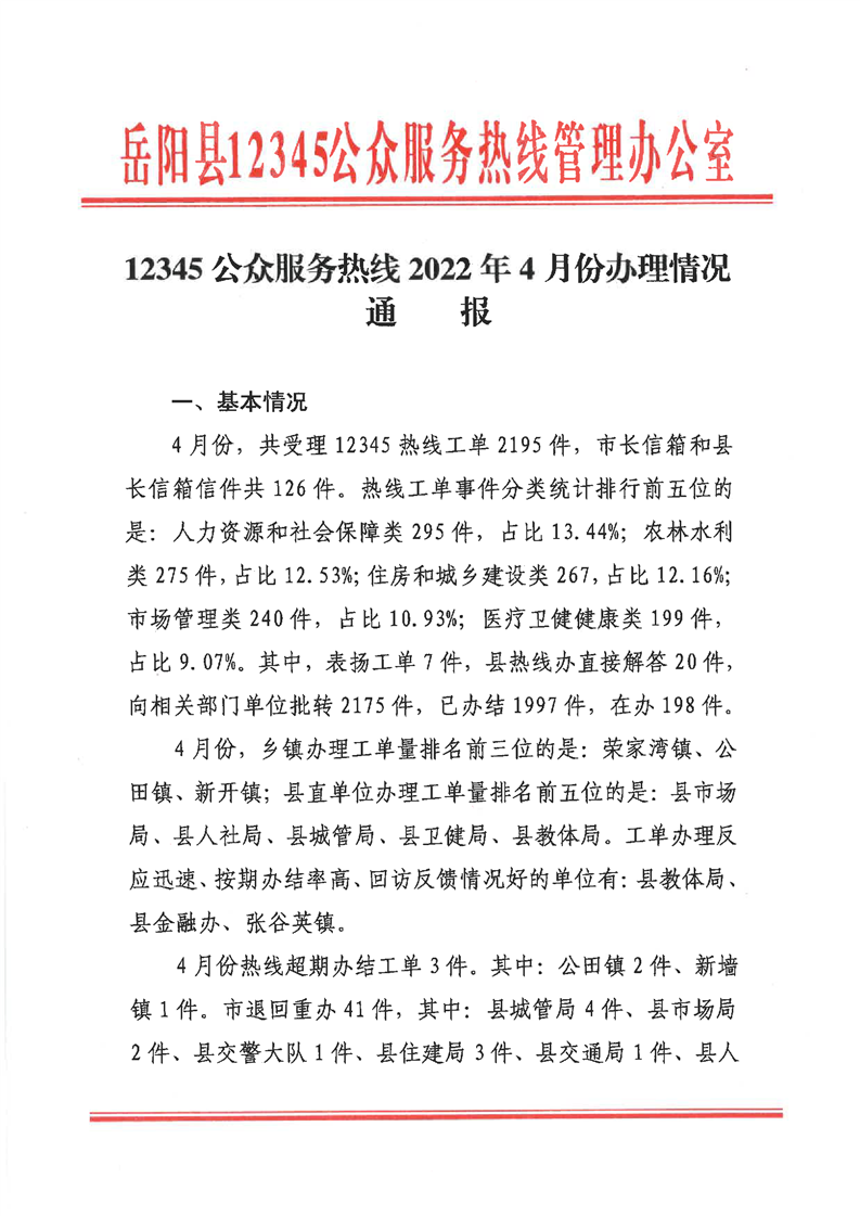 嶽陽縣12345公眾服務熱線2022年4月辦理情況通報