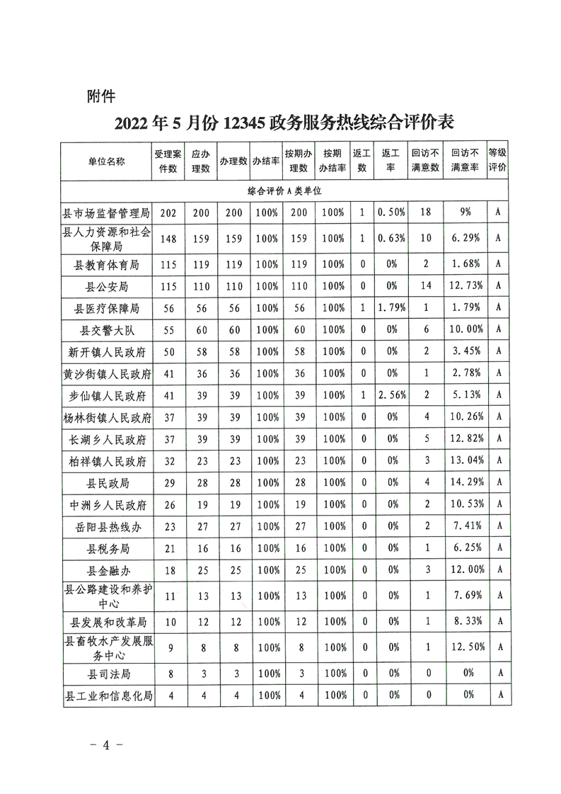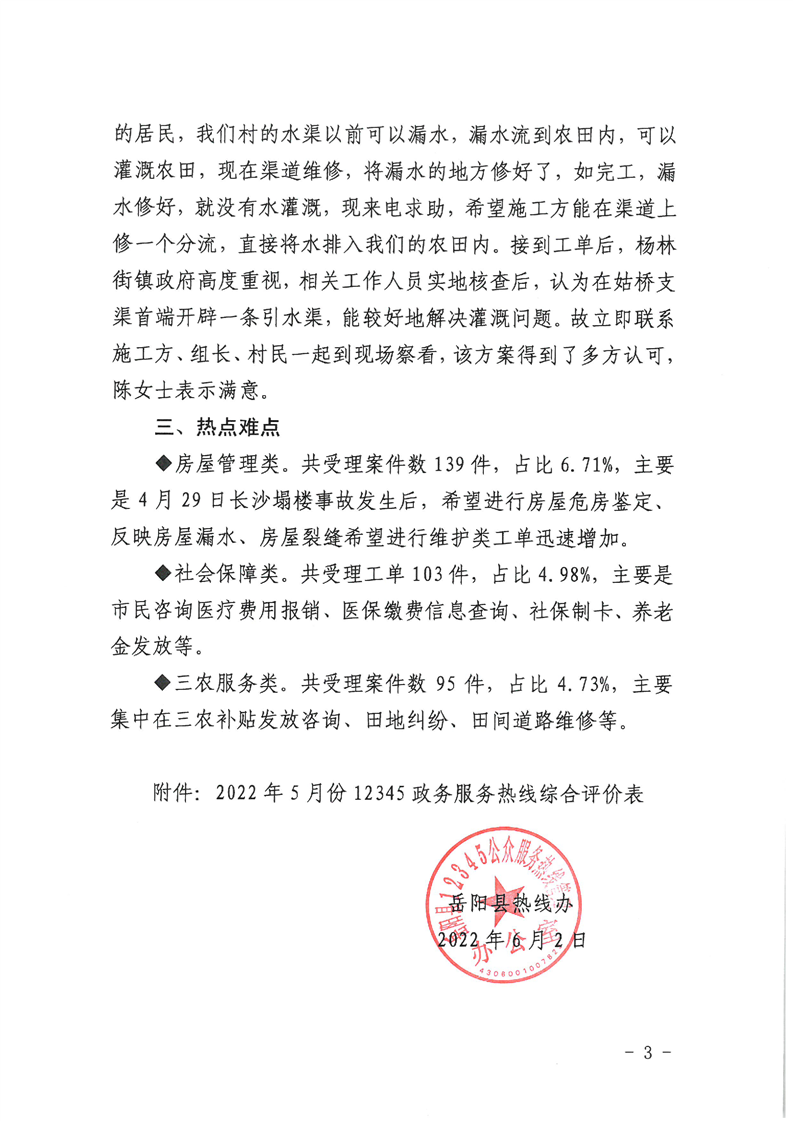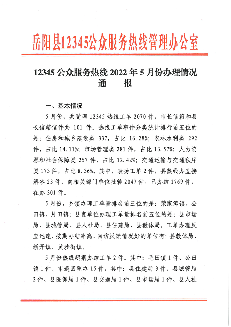 嶽陽縣12345公眾服務熱線2022年5月辦理情況通報
