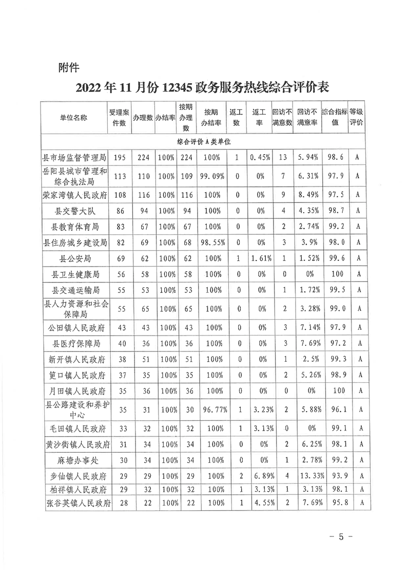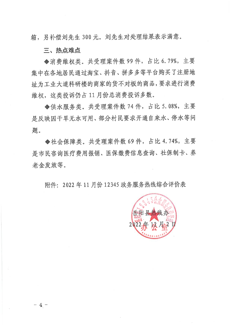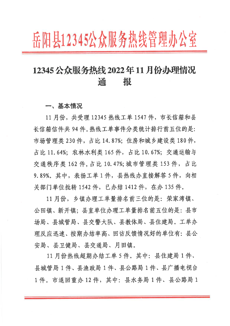 嶽陽縣12345公眾服務熱線2022年11月辦理情況通報