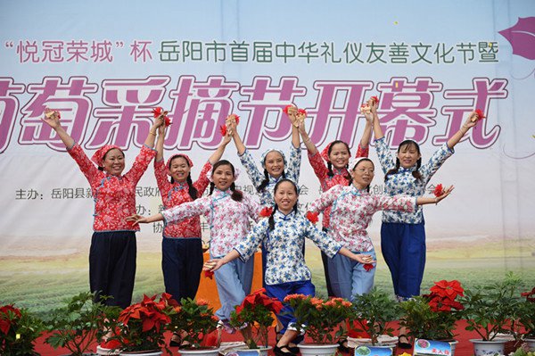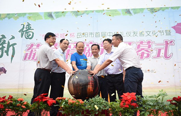 紅網嶽陽縣站8-22訊(分站記者 陳勇平)碩果累累豐收情,最是新牆八-行。8-20,由嶽陽縣新牆鎮人民政府、嶽陽市電影電視藝術家協會、嶽陽市文化創意產業協會主辦,新牆鎮優質葡萄合作社、兆豐文化傳媒承辦,億豐時代廣場、正源國學協辦、悅冠榮城獨家讚助的嶽陽市首屆中華禮儀友善文化節暨2016-新牆鎮葡萄采摘節開幕。5000畝葡萄園開園迎客,引來嶽陽、長沙、武漢及周邊數千名遊客前來品嚐采摘。縣領導易新嶽、胡海平及關心支持新牆葡萄品牌創建的縣直有關領導出席。