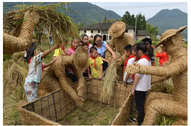 9-18,張穀英景區很有創意地把一根根不起眼的稻草,做成數十組造型迥異、惟妙惟肖、憨態可掬的創意稻草作品,擺放在景區,讓遊客更真實地去體驗農耕文化。