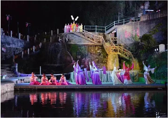 當夜幕降臨後,這裏的實景劇場會呈現一台浪漫、魔幻的山水實景劇,朗朗星空下,坐在群山圍繞的露天劇場,看朗朗星星是那麽地近,看遠處的山巒若隱若現,看變幻的燈光是那麽地美,看多情的喜鵲是那麽地善解人意,為分離的情人搭起鵲橋。
