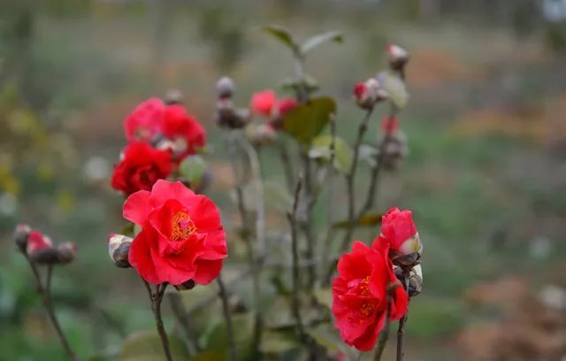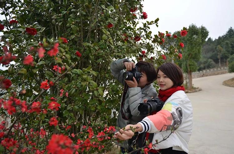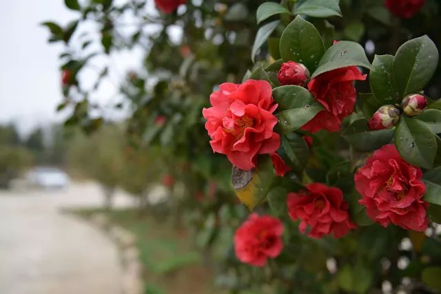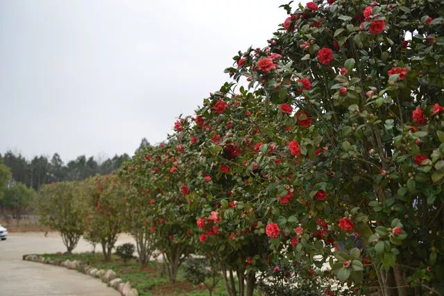 在園中另一角,上千株山茶花正爭先恐後開放,帶來一陣陣沁人的芳香。鮮豔的紅花似熊熊燃燒的烈焰,點燃了春的激情。朵朵綴在枝頭,在綠色的葉片遮掩下,半麵含羞,顯得十分可愛。