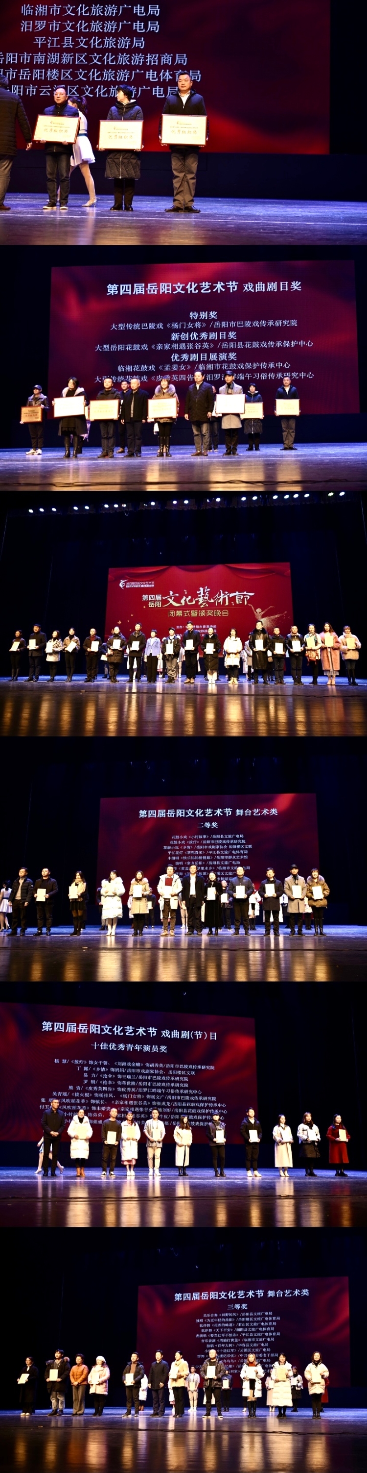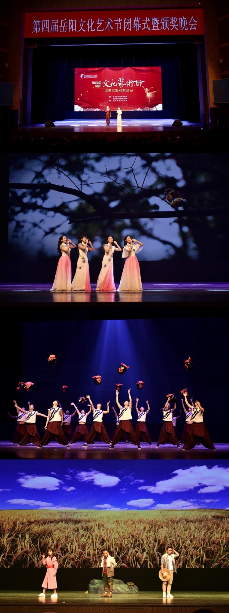 2020年12月29日晚,嶽陽市第四屆文化藝術節頒獎晚會在市會展中心舉辦,嶽陽縣共攬四金兩銀一銅和一個優秀新劇目獎,特別是晚會現場展演的女生小組唱《雨醉山鄉》、舞蹈《打秋》、花鼓小戲《風吹稻花香》以獨有的地方特色、動人的唱腔、絕佳舞美設計收獲最多好評,燃爆劇場。