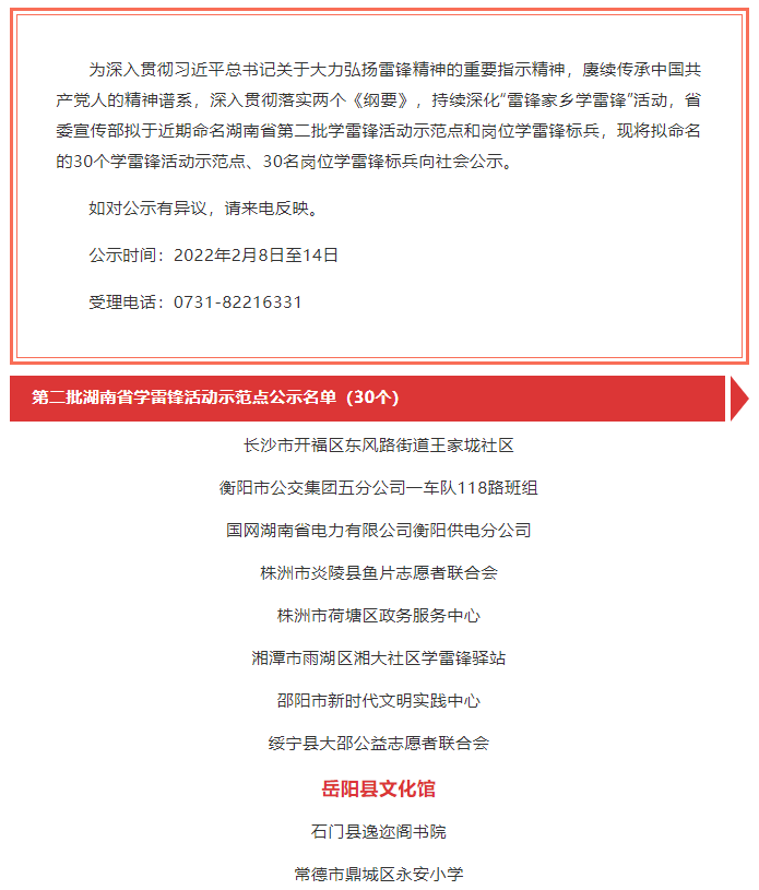 近日,湖南省委宣傳部印發《關於命名首批湖南省學雷鋒活動示範點和崗位學雷鋒標兵的決定》,命名嶽陽縣文化館等30個集體為首批湖南省學雷鋒活動示範點。