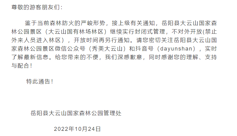 關於嶽陽縣大雲山國家森林公園景區繼續實行封閉式管理的通告