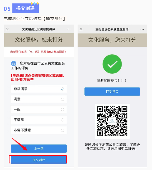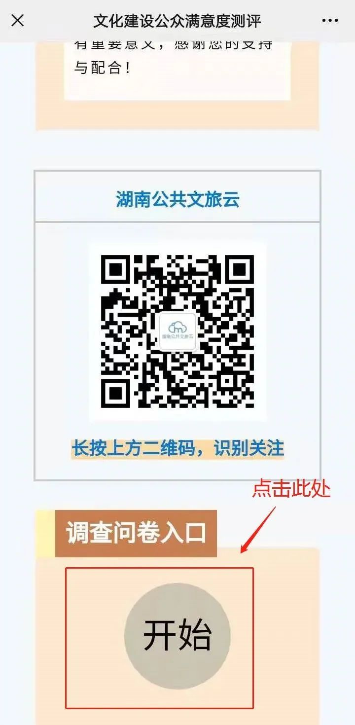 本次測評采用信息化、網絡化手段,由各縣市區自行組織公眾通過“湖南公共文旅雲”平台首頁或微信掃描二維碼的方式,進入“全省公共文化服務體係高質量發展五年行動計劃公眾滿意度測評係統”填寫調查問卷,調查問卷采取不記名形式進行。