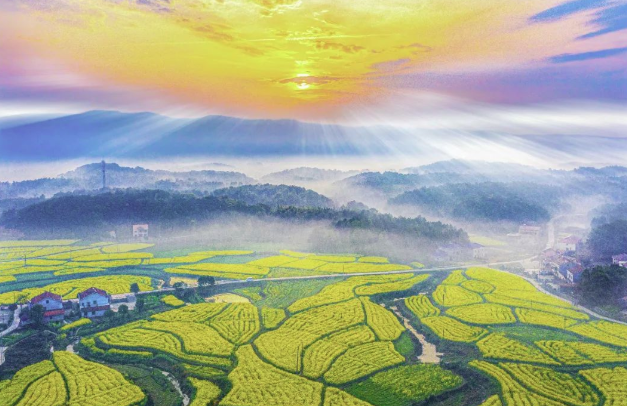 風醉大地麻塘美,雨潤田園菜花香。洞庭靈霧山下,金色的陽光躍出山巔,金色麻塘的花海裏正流淌著金色的希望。遠遠望去,那一抹金黃的光澤,與周邊翠綠的青山、寧靜的村莊相映成趣,勾勒出一幅美麗清新的鄉村田園詩畫。到了這兒遊客可賞花、登山、采果、垂釣·····