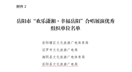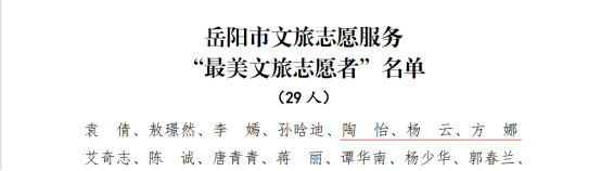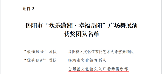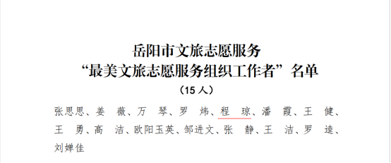 他們中包括“最佳文旅誌願服務組織”1個,“最美文旅誌願服務組織工作者”1個,“最美文旅誌願者”3個,“歡樂瀟湘·幸福嶽陽”合唱展演優秀組織單位1個,“歡樂瀟湘·幸福嶽陽”廣場舞展演“優秀創新團隊”1個,“歡樂瀟湘·幸福嶽陽”廣場舞展演優秀組織單位1個。