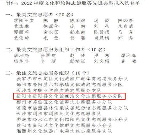 近日,湖南省文化和旅遊廳對2022年度優秀文化和旅遊誌願服務先進典型名單進行了公示,嶽陽縣文化館廉潔文化誌願服務小分隊入選最佳文旅誌願服務組織。