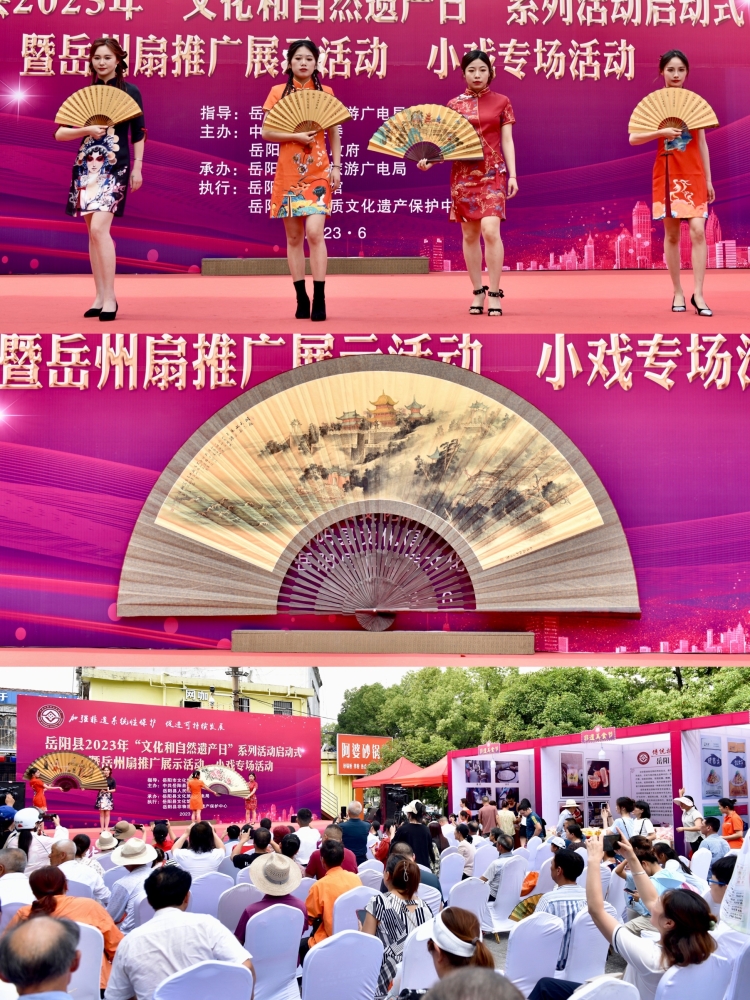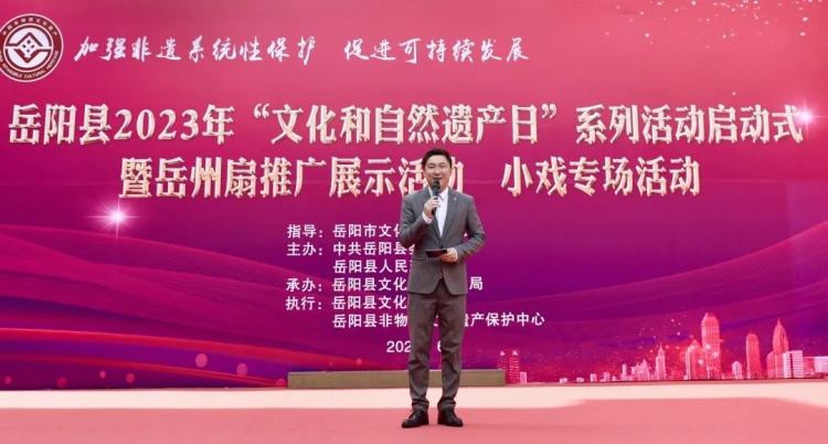 活動共分四大板塊,活動啟動式、非遺美食節、嶽州扇推廣展示活動、嶽陽花鼓戲展演。集中宣傳和展示嶽陽縣優秀非遺項目及非遺成果,讓廣大市民近距離感受非遺的獨特魅力,了解非遺、樂享非遺。縣文旅廣電局黨組書記、局長黃麗娟為活動致辭,縣人民政府副縣長續廣寧為獲得“2022年度全縣非遺保護工作優秀傳承人”彭澤榮頒獎,市文旅廣電局黨組成員、副局長楊川勇宣布活動啟動。市文旅廣電局、縣人民政府相關領導、縣文旅廣電局班子成員及係統幹部職工參加。