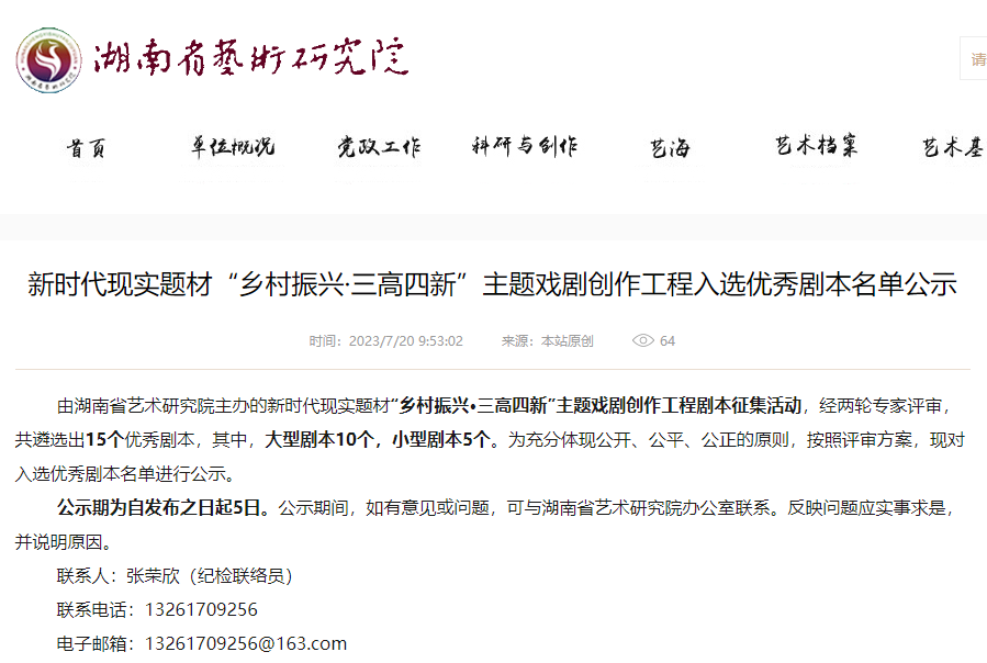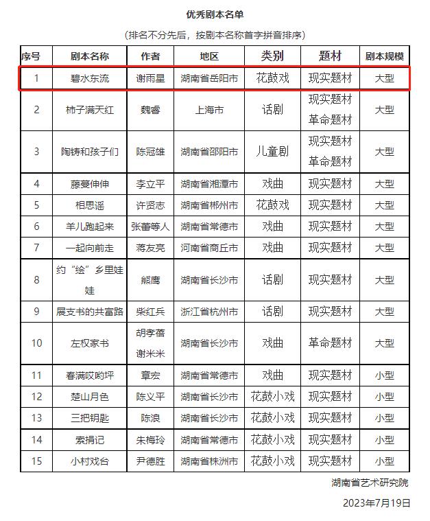 近日,湖南省藝術研究院主辦的新時代現實題材“鄉村振興·三高四新”主題戲劇創作工程優秀劇本入選名單公布,嶽陽縣業餘作者、省戲劇家協會會員謝雨星創作的大型現代花鼓戲《碧水東流》名列其中。
