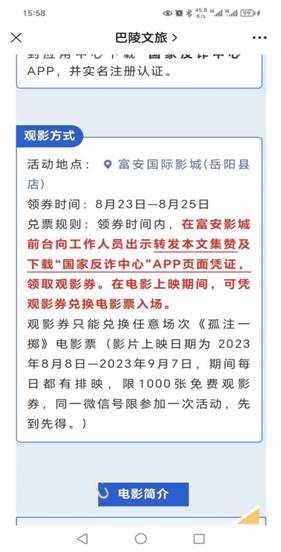 據悉,首部揭露境外網絡詐騙全產業鏈內幕的現實題材電影《孤注一擲》,根據真實境外詐騙案例改編,看過的觀眾都表示深受震撼。為了讓更多人遠離“電信網絡詐騙”這個陷阱,嶽陽縣文旅廣電局推出《孤注一擲》免費觀影,活動期間,市民朋友隻需將活動推文轉發至個人朋友圈,在影城向工作人員出示轉發本文集讚及下載“國家反詐中心”APP頁麵憑證,就能兌換領取總計1000張觀影券,在電影上映期間,可憑觀影券兌換電影票入場。