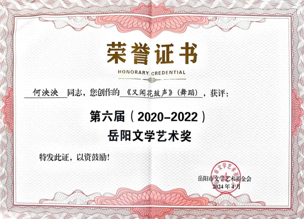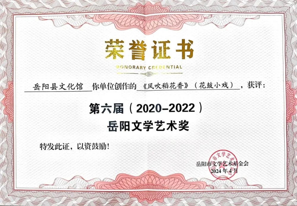 4月11日,第六屆嶽陽文學藝術獎頒獎大會在市文聯隆重舉行,本屆嶽陽文學藝術獎,從籌備到評審,從公示到頒獎,曆時11個月,一批思想精深、藝術精湛、製作精良的優秀作品和德藝雙馨的優秀文藝家脫穎而出。我館創排的花鼓小戲《風吹稻香》、群舞《又聞花鼓聲》榮獲第六屆嶽陽文學藝術獎。